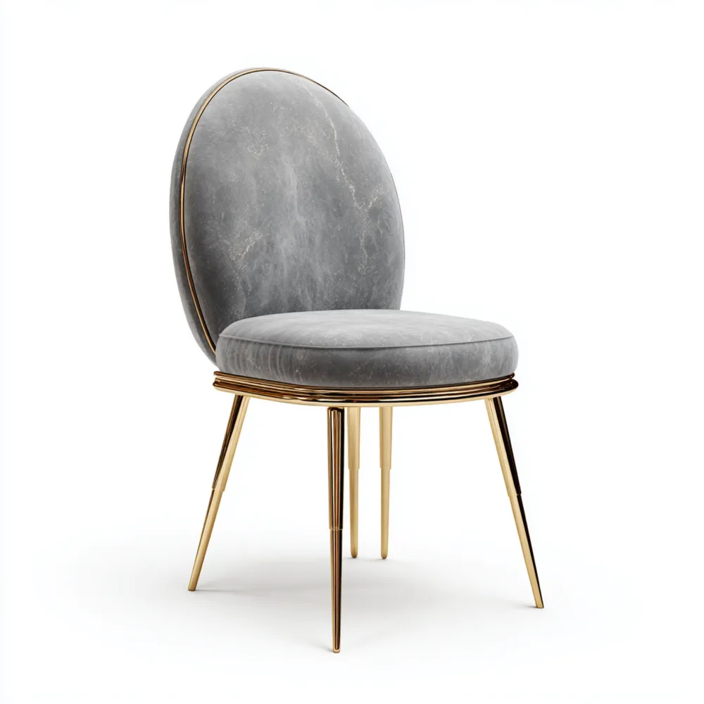 Material und VerarbeitungDer Stuhl besteht aus strapazierfähigem grauem Samt und verfügt über stabile, vergoldete Metallbeine für einen luxuriösen Touch.